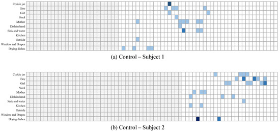 It is important to keep in mind that the observations made above are for consecutive sentences in general. While this shows some aspects of the differences, more important aspects require analyzing the transition between topics for a more extended period of time. To visualize this, in Figure 13 and Figure 14, we show the topics of interest discussed in 2 samples collected from dementia subjects, and two samples collected from control subjects, respectively. In these figures, the gray areas are the padding added at the beginning. The blue areas are where the subjects used words related to each topic. The darker the color is, the more words are used in the sentence. As can be seen, a clear difference can be seen between the patterns of both groups. Control subjects seemed to discuss most of the topics in a clear order: the two subjects were first interested in the center of the image where they described the mother and her actions, and then were interested in the children and their actions. The dementia subjects, on the other hand, seemed to have their attention alternate quite often between the mother and her actions and the children and their actions. They also seemed to repeat, quite often, the same words related to a given subject in the same sentence, or over consecutive sentences. While this is just a qualitative observation of ours, the LSTM is more capable of finding such patterns and building classifications based on them.