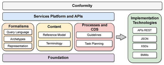 openEHR first specifies a general model organized into components. Each component and its specificities are detailed in the standard definitions. The two reference architectures specified by openEHR are particularizations of this general model. Figure 2 shows the organization of the specifications into functional blocks of the general model proposed by openEHR (available at https://specifications.openehr.org/releases/BASE/latest/architecture_overview.html (accessed on 24 September 2023)). These blocks are organized as follows: