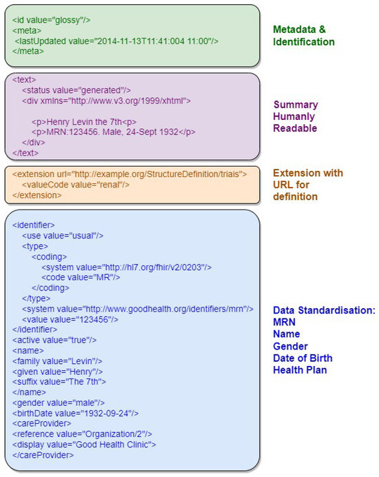 Figure 3 provides an example of an FHIR resource in XML format, highlighting its document structure sections, including resource identifier, version information, resource information in XHTML, and Uniform Resource Locator representation. The first section, in green, contains metadata and resource identification information. The following section, in purple, contains the human-readable summary, represented in XHTML format. The third section, in orange, contains additional information outside the basic definition of the Resource type. The last section, in blue, contains the record data.