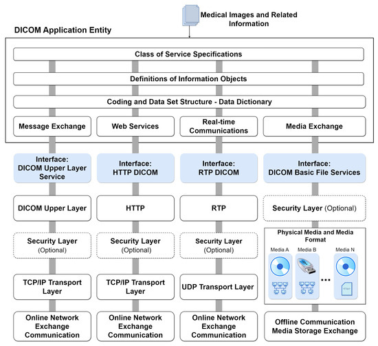 To standardize image representation, DICOM specifies a protocol for exchanging messages. The protocol provides a communication framework for DICOM services and is compatible with TCP and IP protocols. This compatibility enables communication over the internet between different applications that implement the DICOM standard. The DICOM communication protocol was developed based on the model open systems interconnection (OSI) reference model and implements functionalities of the application, presentation, and session layers (available at https://docs.oracle.com/cd/E57425_01/121/IMDCM/ch_intro.htm#IMDCM13799 (accessed on 24 September 2023)). An application that uses the DICOM protocol is called an application entity (AE). Each AE can request or provide one of the services of the DICOM protocol, called classes of services. Each service class consists of data and a function related to those data. Each service class consists of data and a function related to those data. For example, an MRI image can be associated with different functions, such as printing or storing. When an AE requests a service, it plays the service class user (SCU) role, and when the AE provides the service, it plays the service class provider (SCP) role. Communication between two AEs requires the establishment of a session called an “association”. Establishing the association starts with exchanging important information, such as supported data encoding and the services provided by the SCP. After association, the SCU can request classes of service from the SCP. After sending the service classes, the association is finalized [16]. Despite specifying a communication standard, the DICOM communication protocol is not generic, only being capable of exchanging DICOM messages.