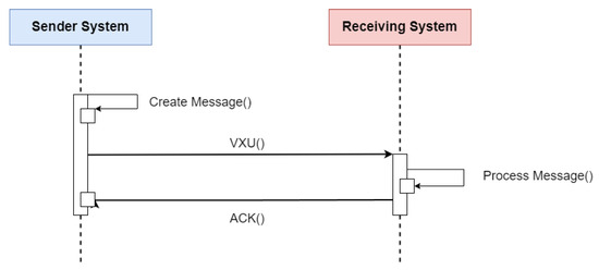 HL7 V2 (available at https://www.hl7.org/implement/standards/product_section.cfm?section=13 (accessed on)) is a standard for exchanging messages in the context of medical applications, whose main function is to define standards for the content or body of messages, a protocol for sending and receiving messages and defining different context requests, such as history requests and demographic data, among others. The HL7 V2 messaging framework is based on an event-based messaging paradigm. HL7 V2 defines the communication syntax at a low level, without worrying that messages are human-readable, by enclosing the entire message content in a string of characters. Figure 5 depicts the message content based on the HL7 V2 standard (available at https://www.ringholm.com/docs/04300_en.htm (accessed on 24 September 2023)), showing that a vertical bar sign separates data “|”, wherein the data identifier is on the left side while the value is on the right. However, recent HL7 V2 versions use XML as an alternative encoding format. Thus, the choice of which data and values must be in the message depends on the context of the request and its respective flow. Figure 6 shows the message flow for transferring immunization information from one health information system to another. The issuing system could be an EMR system, an immunization information system (IIS), or another type of health information system. An event such as an update or new record inserted in the issuing system initiates the creation and sending of a VXU message (vaccination update) containing an updated immunization record. The receiving system processes the message according to the used profile, applying local business rules. After successful processing, the receiver sends an acknowledgment message (aAcknowledgement—ACK) and adds the new record to the receiving system [15].