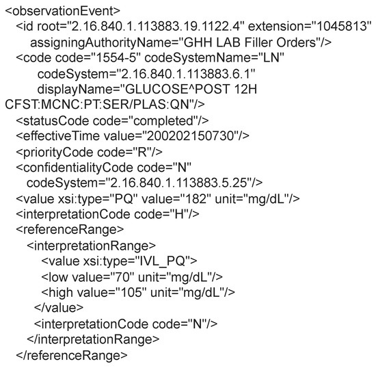 All the flows, communication protocols, and terminologies adopted for HL7 V2 form the basis for HL7 V3, which focuses on specifying the encoding of messages using XML and its syntax. In this way, the pattern becomes more intelligible and easier to implement. Figure 7 presents an excerpt of the same message (available at https://www.ringholm.com/docs/04300_en.htm (accessed on 24 September 2023)) shown in Figure 5, but structured according to the HL7 V3 standard. The example shows a patient’s glucose test result and additional information that adds semantics to the data hierarchically.