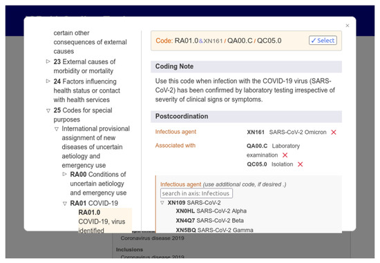 For queries in the ICD-11 database, WHO provides three main components: a REST API over HTTP, a web graphical user interface (available at https://icd.who.int/browse11/l-m/en (accessed on 24 September 2023)), and a coding tool where users can assemble the correct ICD-11 code for a disease and its additional information. The tool is helpful for testing and validating software that uses the ICD-11 coding system. Figure 8 shows the web interface of the ICD coding tool, highlighting an ICD-11 code generated just by selecting the characteristics of a disease. The user can search for keywords and select the desired combination of factors for a record. The example shows the code generated for the COVID-19 disease confirmed by a laboratory test, with the virus in its SARS-CoV-2 Omicron variant, with the patient in isolation.