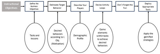 The 6D approach (Figure 2) to gamification was used in order to obtain a systematic approach to the 6 steps existing in this framework [29], which are: