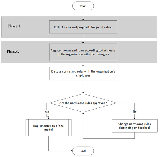 To set the narrative and explain Figure 3, the first step focuses on the survey and study of existing solutions on the market, carried out by the entity that compares rules and norms of similar solutions with the rules and norms created by the organization. The origin of these rules and norms comes from direct discussions between employees and managers and from general ideas managers suggest. This collation of ideas was created over the course of working days and in meetings that focused exclusively on this until the initial set of rules and norms were defined. So, the first and second phase started with, in a first instance, a meeting held with the company’s managers with the objective of registering norms and rules according to the needs described by them and with the research completed. Here, an initial set of norms and rules was created which, after being defined, were presented to the employees in the third phase, in order to understand their position relative to them. All of this aims to bring the gamification model closer not only to the company’s needs but also to the employees’ needs and expectations, thus leading to the inclusion of different entities in a single narrative so that the narrative may incorporate a point of balance between the needs of the organization and its employees. In addition to his adjustment to several entities, this inclusion also foresees guaranteeing a greater impact on the organization at the motivational level on subordinates.