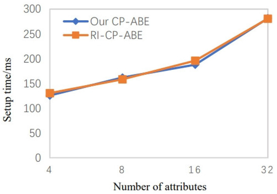 We conducted simulation experiments in the aspects of system establishment time, key generation time, encryption time, decryption time, revocation time, and decryption after revocation time. Since only scheme RI-CP-ABE has integrity, therefore, we compared our scheme with RI-CP-ABE. The specific algorithm of reference in RI-CP-ABE is shown in Appendix A. Because our computer runs with limited memory, the number of attributes in the access policy is set to 4, 8, 16, and 32 (the number of attributes in the system). The experiment was conducted 100 times in total, and the average value of the experimental results of 100 times was taken as the final result of this experiment to ensure the accuracy of the experiment.