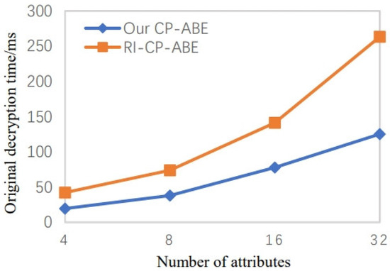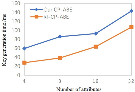 The time cost of system setup is shown in Figure 3, indicating that the calculation cost of the method in this article is basically the same as that described in the literature RI-CP-ABE. The system key generation time overhead is illustrated in Figure 4. The results of experimental simulations demonstrate that the calculation cost in our scheme is more than that of the literature in RI-CP-ABE. Because we introduced the 2PC protocol to solve the key escrow issue, which guards against the misuse of users’ private keys, it is more useful in real-world applications. The figure shows that the time growth rates of the two systems are nearly equal as the number of attributes increases. Furthermore, the key is generated only once, and the impact on the overall system efficiency can be ignored.