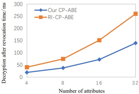 The system revocation time and the decryption time after the user is revoked overhead are illustrated in Figure 7 and Figure 8, respectively. Our scheme requires less time calculation in the user revocation stage and the decryption step than RI-CP-ABE. As a result, our scheme has higher efficiency in practical applications.