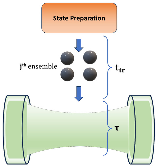 The model we consider in this work is illustrated in Figure 1. Four-atom ensembles are prepared in a predetermined state and then injected to the cavity randomly, one ensemble at a time. Following Ref. [62], the distribution of the arrival time of the atomic ensembles to the cavity are designed to be Poissonian. The transfer time from the state preparation to the cavity is , and after interacting with the cavity field during , atomic ensembles exit the cavity.