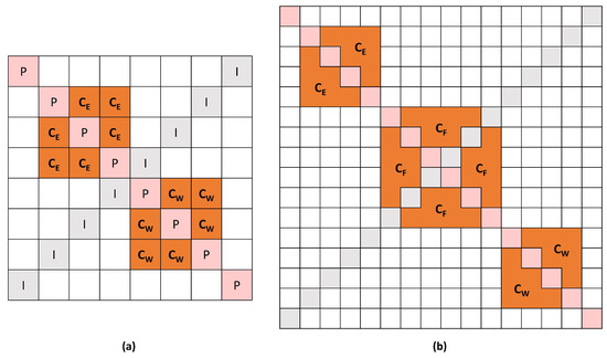 Expressing the states in the energy basis and providing illustrations of their corresponding density matrices, as depicted in Figure 2, is not only recommended for facilitating calculations but also enhances the clarity in visualizing the individual states’ contributions to the desired coherence in heat exchange. The E and W components contribute to the and , respectively, in both three- and four-qubit systems. However, in the four-qubit case, there is also (the central block).