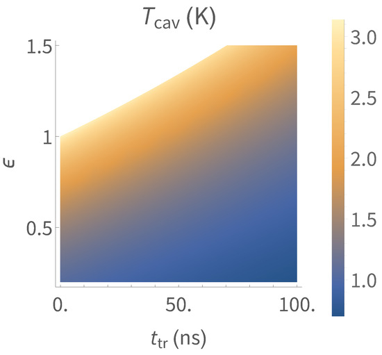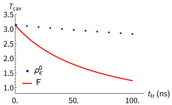 For a finite , the optimal value of depends on . In Figure 3, we plot the cavity temperature in Equation (31) in the region satisfying the condition. We show that by tuning the control parameter of the initial state according to the expected flight time, the effect of the decoherence is almost reset, and the machine performance is almost not affected from the decoherence. In order to have a clearer perspective, we compare the machine performance between two scenarios where the atomic systems are prepared in the F state and in the state. Although the F state is optimal in the limit, it is vulnerable to the decoherence. As shown in Figure 4, in the case of realistic flight times, it degrades the machine performance significantly. In the second scenario preparing the atomic systems in the state, we developed a numerical simulation for evaluating the machine performance. For every selected flight time with 10 ns intervals, we found the approximate maximum value of the parameter without violating the condition. This result clearly shows the advantage of engineering a state optimal for protecting the quantum thermalization machine performance against the decoherence on the atomic system due to realistic ambient temperature.