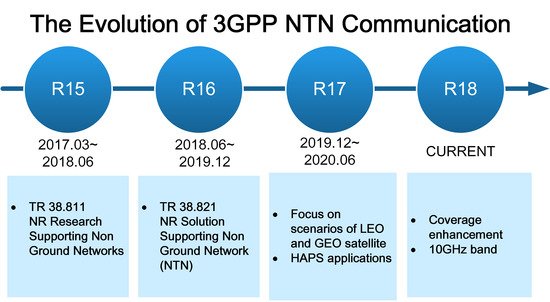 Non-terrestrial networks (NTNs) were first mentioned in the use case of fifth-generation (5G) communication standards, and the concept has drawn extensive attention from research scientists for the grand vision of space–air–ground–sea integrated networks (SAGSINs). The 5G ecosystems have included satellite communications as an important means of producing NTNs. The initial research of NTNs started right after the Third-Generation Partnership Project (3GPP) organization announced its first release of the 5G communication standards containing the NTN concept. Since then, a variety of research papers have been published concerning NTN technology. The evolution of 3GPP NTN standards of 5G communication is illustrated in Figure 1. In release 15 of 3GPP 5G standards, TR 38.811 was introduced as “NR Research Supporting Non-Ground Networks”, which illustrated the application scenarios of NTN communications and pointed out the unresolved problems that may have a great influence on the application of NTNs. The next evolutionary step of 5G NTN was finished with release-16 of 3GPP, which put forward solutions for supporting NTNs, in which satellite communications were listed as a priority for NTN applications. In release 17 of the 3GPP 5G standards, LEO (low Earth orbit) and GEO (geostationary transfer orbit) satellite applications were emphasized, while high-altitude platform station (HAPS) applications were also taken into account. Finally, 3GPP froze the release 17 standards at its 96th plenary session. A practical architecture of a NTN communication network is shown in Figure 2, which can be divided into space, air, and ground layers. The top part of the NTN network architecture is the space network, which is usually made up of a number of inter-connected satellites, while the middle part of the network is composed of HAPS (high-altitude platform stations), LAPS (low-altitude platform stations), and air-to-ground networks utilizing UAVs and airships. The ground part is the conventional terrestrial network [18,19,20,21,22,23].