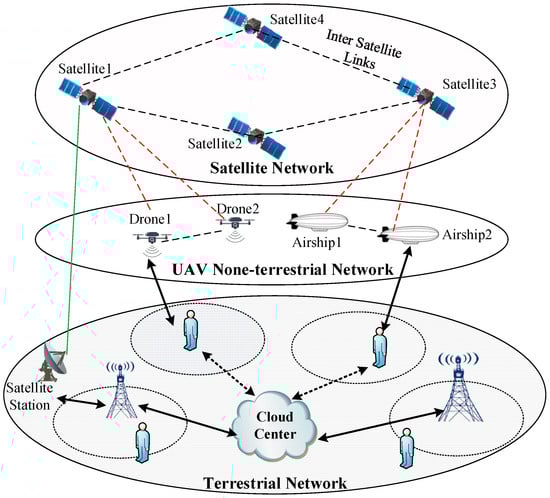 In recent years, the development of unmanned aerial vehicles (UAVs) and satellites has brought about extensive opportunities for NTN applications with low cost and deployment flexibillity. Furthermore, 4G/5G infrastructural deployments on the ground have steadily increased across the globe, with numerous cellular base stations around cites and along highways. However, in remote or unreachable regions, such as deserts and mountainous areas, ground cellular network coverage is not available due to high cost or environment limitations [8,9,10,11,12]. In addition, the use of NTNs is beneficial when ground networks are overloaded during special events like sports games or due to the sudden failure of base station infrastructure due to natural disasters in specific areas. Therefore, in the scenarios mentioned above, non-terrestrial networks (NTNs) are a promising solution for providing communication coverage in areas that are unable to be covered via traditional ground infrastructure. In some cases, especially in conditions such as power failures caused by disasters or a sudden increase in the number of users, the need for ubiquitous network access can only be met using non-terrestrial communication methods such as unmanned aerial vehicles (UAVs) or satellites [13,14,15,16,17,18].