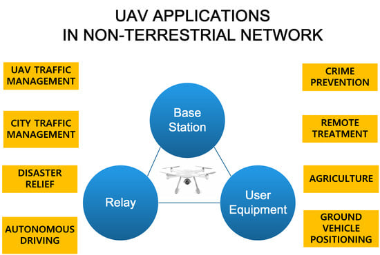 NTN technology represents new prospects in wireless communication applications such as satellite communications and low-altitude communication utilizing unmanned aerial vehicles and airships for internet of things devices or autonomous systems. UAVs and airships acting as radio access network infrastructure are capable of providing lower-latency services than satellites, which is crucial for time-critical applications. NTN communication expands the application of 5G communication from terrestrial communication to space/air communication. The transformative advancement in communication technology promoted the shift from fifth-generation communication to sixth-generation, which highlights the vision of ubiquitous networks and space–air–ground coverage [24,25,26,27].