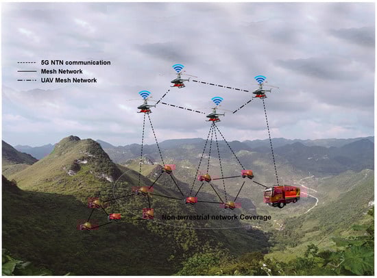 Figure 4 illustrates a real-world senario of wildfire detection and early warning in mountainous regoins. A group of unmanned helicopters equipped with 5G base stations and mesh communication payloads is deployed to provide network coverage for firefighters in mountainous areas. Images containing fire point information, collected via optical and thermal sensors on board the UAVs, are then transmitted to the ground command truck via a UAV 5G network. After image processing and recognition, fire point locations are distributed to individual firefighters via the non-terrestrial 5G network and displayed on their helmet-mounted AR devices or cellphones. UAV-assisted networks have facilitated a variety of applications, such as post-disaster area assessment, personnel search, and information collection [76,77,78].