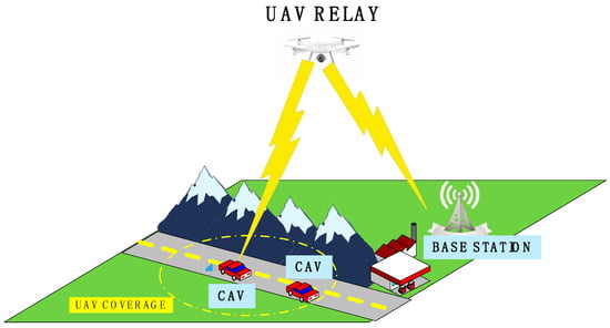 Non-terrestrial networks tend to be an effective means for V2X communications. UAV non-terrestrial networks show promise for estabilishing V2X connections scenarios where signal blockage occurs due to buildings and challenging terrains. However, UAV-based V2X communication still faces underlying challenges, including ultra-low latency communication, limited battery life, high volume communication, and low access efficiency. A variety of studies have been published on non-terrestrial UAV V2X communication for CAVs, addressing issues such as low-latency vehicle-to-vehicle communication, energy consumption optimization, and channel prediction. Researchers [137] analyzed rotary-wing and fixed-wing unmanned aerial vehicles as CAV network access points, using millimeter-wave technology for high-speed connectivity to CAVs (Figure 5). Based on the study results, UAV HAPS systems outperformed low Earth orbit satellites (LEOs) in terms of lower latency. To address the latency issues of CAV V2X communication [138], explored a scheme involving UAV-assisted deployment of roadside units, with a focus on minimizing CAV latency while also optimizing CAV energy consumption. To address the requirements of vehicular platooning or formation control issues, a study in [139] evaluated a UAV-V2X network in the context of UAV unstable motion. The evaluation involved the use of association probability for a vehicular-to-UAV link, while vehicular-to-vehicular links were modeled using the Poisson point process. In V2X connections, data dissemination is essential for sharing information between CAVs. In reference [140], a novel dynamic path-planning method for a UAV base station was employed to optimize the data dissemination process by minimizing communication overhead. This method aimed to enable efficient data caching in V2X networks.