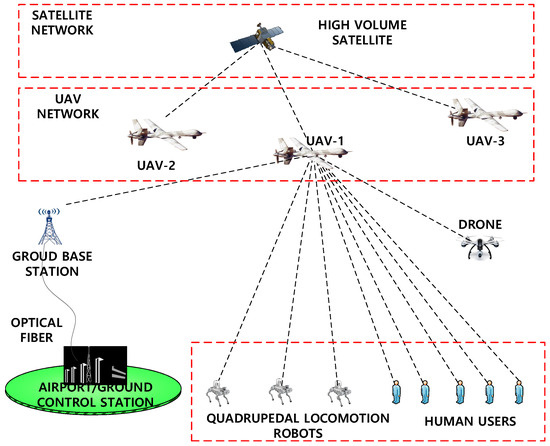 The concept of non-terrestrial networks (NTNs) that are capable of providing wireless communication coverage in complex and non-ideal environments is a popular topic, especially for conditions where a reliable means of wireless connections for time-critical tasks is urgently needed. Previously, wireless cellular communication services were designed to offer coverage to human users with smart phones or other portable devices; however, recently, machine-type communication is also in significant demand, such as with internet of things (IoT) devices and machine-type communication (MTC) devices. The demand for communication services further drives network evolution and expansion into non-traditional areas such as industry applications, remote surgery, AR/VR and so on [1,2,3,4,5,6]. Unmanned autonomous Intelligent system (UAISs), such as self-driving vehicles, multi-robot systems, unmanned aerial vehicles, and unmanned ground vehicles have experienced increasing demand in terms of ubiquitous wireless connection requirements to fulfill tasks such as perception, localization, navigation, collaboration with nearby agents in a multi-agent system, and the offload of computation-intensive tasks to back-end or resource-abundant facilities [7].