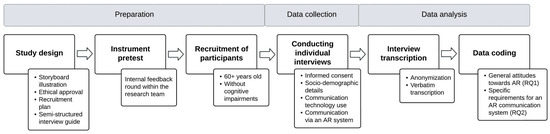 The study entailed semi-structured qualitative interviews with older adults. Although there is no unified definition of an “older” person, we adopted the World Health Organization’s standard and defined an older adult as a person above 60 years old [56]. The study design is comparable to other qualitative studies exploring users’ attitudes toward AR published in this journal (e.g., [57,58]).
