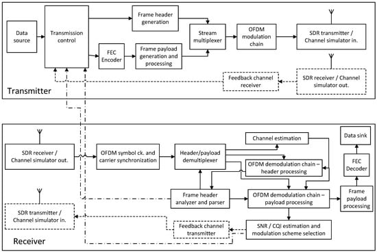 - Polgar, Z.A.; Stef, M. OFDM Transceiver with Adaptive Modulation Implemented in GNU Radio. In Proceedings of the 2023 46th International Conference on Telecommunications and Signal Processing (TSP), Prague, Czech Republic, 12–14 July 2023; pp. 37–42. [Google Scholar]