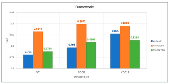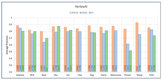 TAO outperformed VertexAI (excepting for the VOC12 dataset), but underperformed AutoGluon across all datasets when comparing their mAP. Like in AutoGluon, we trained our models using the Google Pro+ runtime environment with NVIDIA A100 GPUs. In this case, the base network was Yolo V4 with a ResNet18 backbone. The batch size was eight and the number of epochs was 80. The learning rate had a minimum of 1 × 10−7 and a maximum value of 1 × 10−4. The VOC training time was 286 min. The COCO training time was 147 min and V7 was 336 min. In Figure 7, we provide the AP across each class.