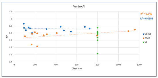 The datasets designed for classification may have particular classes over or under-represented which affects the ability of the model to recognize edge cases [50]. In this study, we also explore the effects of class imbalance and dataset size on performance by observing model accuracy as a function of class size. In Figure 8, we plot the AP of each class as a function of its size for the VertexAI framework. Figure 9 plots the AP by class size for the AutoGluon framework and Figure 10 plots the AP by class size for the TAO framework. Figure 8, Figure 9 and Figure 10 show no clear relationship between the class size and AP.
