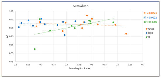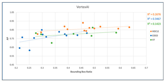 Previous research had focused on the effects of object occlusion, image resolution, and object size with regard to accuracy [51,52,53,54]. Hoiem et al. [55] found in their study that AP was most sensitive to object size with occlusion, truncation, and with aspect ratio also having a considerable effect. We include in this research another metric which we refer to as the “bounding box ratio”. This is the ratio of the object bounding box size to the overall image size. Since the bounding box corresponds to the height and width of the object in the image, and we have selected our dataset images to only include single object instances, this can be used as a proxy for the apparent object size. We can then evaluate the average precision for each class as a function of the average bounding box ratio for that class. The evaluation was done using the Pascal VOC AP standard, where the IOU threshold is set to 0.50 and the PRAUC is interpolated continuously. VertexAI provided the AP and mAP metrics directly after training, but in the case of NVIDIA TAO and AutoGluon, we use the set of predicted labels provided by each trained model and a Python library to calculate AP and mAP [10].