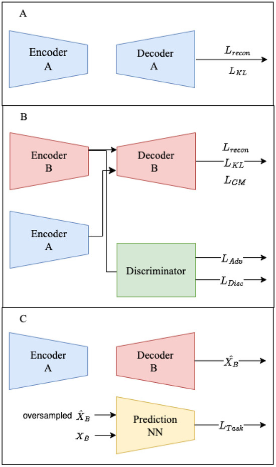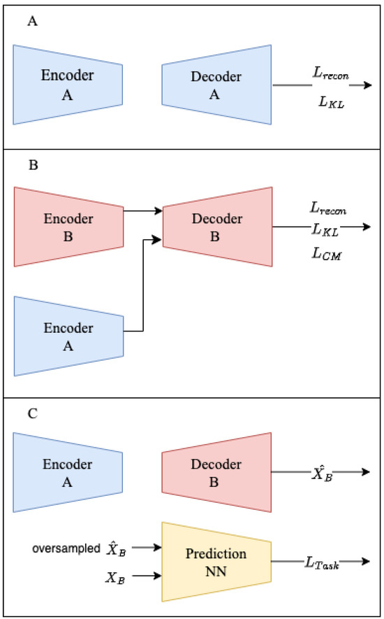 DACMVA training procedure for CM-VAE-OV. (A) Train the modality A VAE. (B) Train the modality B VAE, aligned with the A latent space. (C) Impute and oversample for the training prediction task.