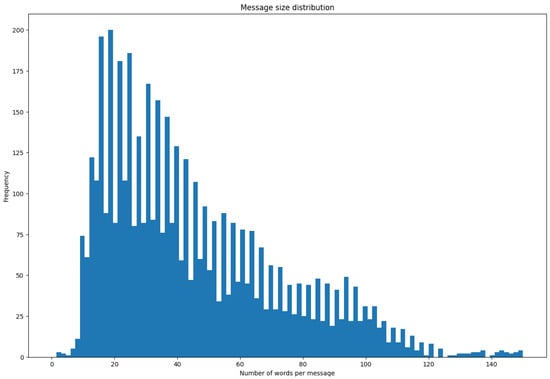 The input texts exhibit a considerable number of grammatical errors, spelling mistakes, omitted letters, duplicated letters, improper use of punctuation marks, and various unconventional or malformed words. These linguistic deviations are often associated with specific online communities and can vary based on individual writing styles and expressions of ideas. In addition, some offensive language is intentionally misspelled to evade existing profane word filters. Some of the employed techniques include the replacement of the actual letters with other non-alphanumerical characters (such as “a” with “@”), introducing non-alphanumerical characters, especially punctuation marks in the structure of the words, repeating letters in a word, and using abbreviations. The distribution of the length for the selected comments is presented in Figure 1 and varied from 5 to 1487 characters and from 2 to 323 words.