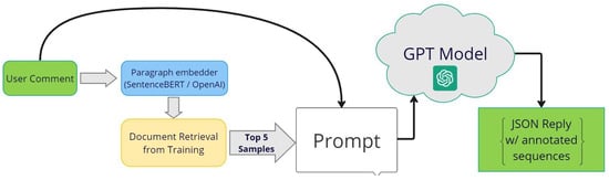 The temperature was set to 0 in all experiments to avoid changes in the input text by the GPT models. This grounded the model in a more-deterministic and =focused output. Figure 3 illustrates the few-shot sequence-detection process described above.