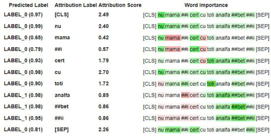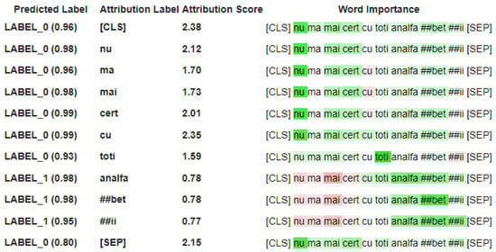 The first experiment considered token classification using a BERT-based model, more specifically the Romanian-language pre-trained BERT version, RoBERT [58], followed by a fully connected feed-forward layer that outputs a label probability for each token.