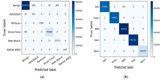 - The proposed IDS’s performance was evaluated using two datasets—the widely accepted CICIDS2017, known as CICIDS, for network intrusion detection, and the car-hacking dataset pertinent to IoV security.