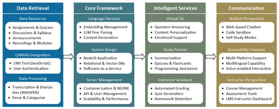 The system architecture of the artificial intelligence-enabled intelligent assistant (AIIA) (Figure 1) framework serves as the foundation for its operation and functionalities within the higher education context. This architecture comprises four primary components: (1) Data Retrieval, which focuses on obtaining and processing various data resources through CANVAS integration and transcription services; (2) Core Framework, which encompasses the design and implementation of language services, system design, and server management to ensure efficient operation; (3) Intelligent Services, which includes the virtual TA, study partner, and instructor assistant functionalities that cater to the diverse needs of students and instructors; and (4) Communication, which facilitates seamless interaction between the system and its users through web-based chatbots, accessibility features, and multi-platform support. This comprehensive architecture enables the AIIA framework to deliver personalized and adaptive learning experiences, fostering enhanced engagement and improved learning outcomes in higher education environments.