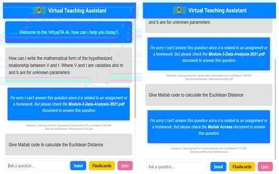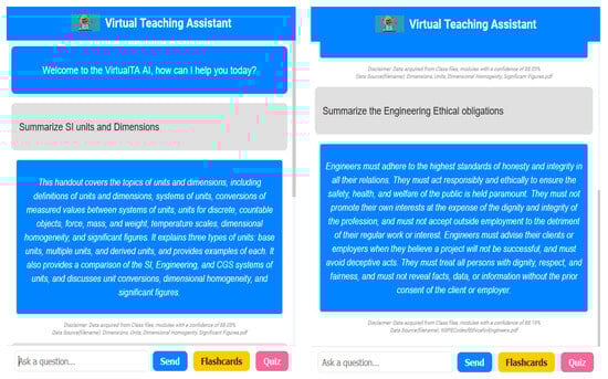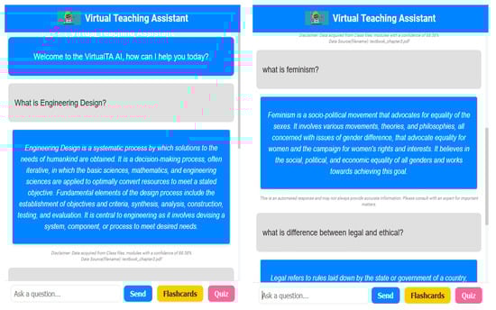 Artificial intelligence (AI) and natural language processing (NLP) have emerged as promising technologies with the potential to revolutionize the educational landscape. NLP and knowledge generation systems have been used actively for communicating data and information [] in environmental [], health [,], and even disaster management contexts, where techniques such as word embedding have been successfully applied to improve information retrieval during crisis situations []. The advent of AI-enabled tools, such as virtual teaching assistants (VTAs), offers a unique opportunity to bridge the gap between traditional teaching practices and the evolving needs of students []. VTAs can provide personalized support, instant feedback, and adaptive learning experiences, thereby enhancing student engagement, satisfaction, and learning outcomes [].