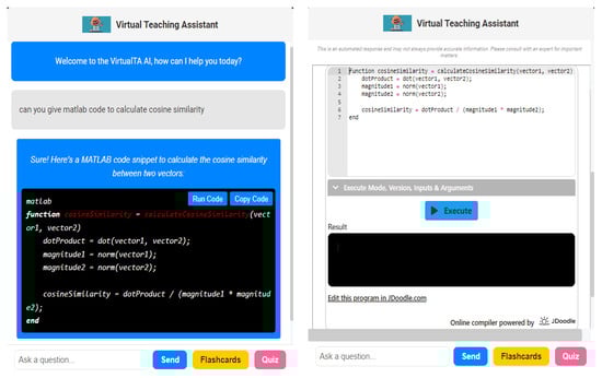To enhance the learning experience and cater to students with varying levels of programming proficiency, we have integrated a coding sandbox environment directly into the chatbot interface. This feature allows users to seek assistance with programming-related queries and provides a convenient platform for code execution and clarification. Whether it is a programming course or a non-CS domain, students can ask for guidance or clarification on code snippets. The system automatically detects the programming language being used and, upon the user’s request to “run code”, opens up a coding sandbox environment within the chatbot itself. This eliminates the need for students to have prior knowledge of integrated development environments (IDEs) or programming tools.