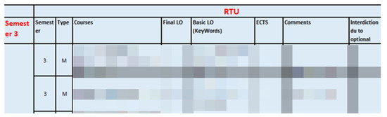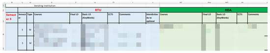 Figure 1 showcases the detailed analysis of the study programs as supplied by the participating HEIs. This Excel chart illustrates the various courses offered in the third semester, highlighting the course type, final learning outcomes, basic learning outcomes (keywords), European Credit Transfer and Accumulation System (ECTS) credits, and comments. For example, courses such as “Supplementary Mathematics” and “Probability Theory and Mathematical Statistics” are presented along with their respective learning outcomes and credits, providing a clear overview of the academic structure and content for students at Riga Technical University (RTU) and the corresponding courses at the Hochschule Darmstadt (HDA).