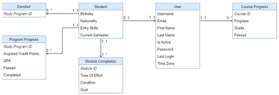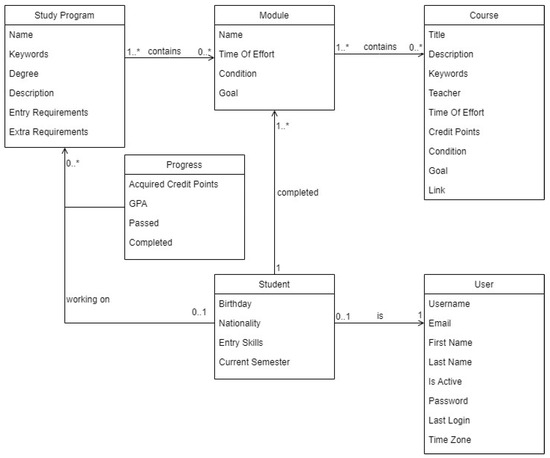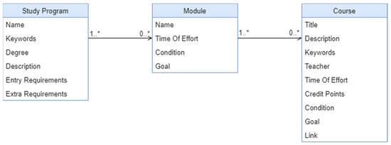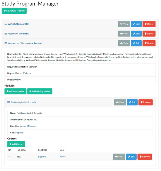 The Content and Knowledge Management Ecosystem Portal (KM-EP) [44] is a robust platform designed to streamline the management of scientific content and knowledge. It provides researchers with a unified system that eliminates the need to recreate fundamental functionalities such as user management and scheduling, thereby saving valuable time and effort. The KM-EP leverages the Symfony framework, a renowned PHP framework noted for its extensive community support, reusable components, and comprehensive documentation. This framework facilitates the development of applications using the Model View Controller (MVC) architecture, where controllers are coded in PHP, data are managed in MySQL within the model layer, and the user interface is developed using jQuery, AngularJS, and Bootstrap in the view layer. Currently, KM-EP comprises 14 distinct components that collectively enhance its capability to manage various facets of content and knowledge effectively. These components are designed to ensure seamless integration and interoperability, which are essential for advanced educational and research management systems. Key among these are the schema designs for student administration and syllabus management, as well as the user interfaces that support these functionalities. The subsequent figures (Figure 4, Figure 5, Figure 6 and Figure 7) will illustrate the schema design of the KM-EP student administration, the schema design of the KM-EP syllabus manager, and the user interface of the KM-EP syllabus manager, providing a visual representation of these essential components.