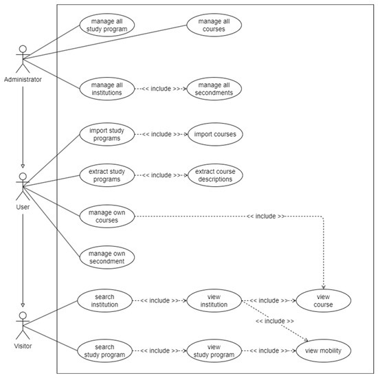 The use context of the higher-education system involves several use cases and corresponding requirements, as depicted in Figure 8. This unified modeling language (UML) diagram outlines the interactions between different user roles (administrator, user, and visitor) and the system.