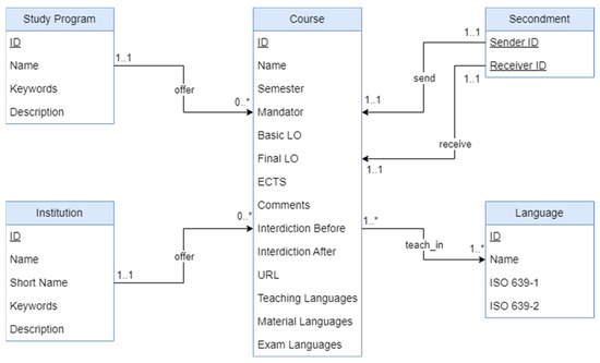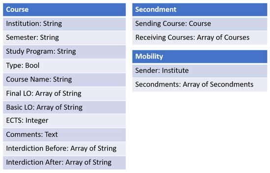 The distributed local schemes of the higher-education information system (HEI-IS) to be integrated focus on key areas such as courses, secondments, and mobility. As shown in Figure 9, these schemes encompass essential data structures that support the management of academic programs and student exchanges. The Course schema includes fundamental information about courses, such as the institution, semester, study program, learning outcomes, and ECTS credits. The Secondment schema manages the relationships between sending and receiving courses for secondment opportunities. The Mobility schema handles the transfer of secondments between institutions, tracking the sender and associated secondment programs. These high-level schemes facilitate the integration and interoperability of HEI-ISs, ensuring the efficient management of educational processes and student mobility.