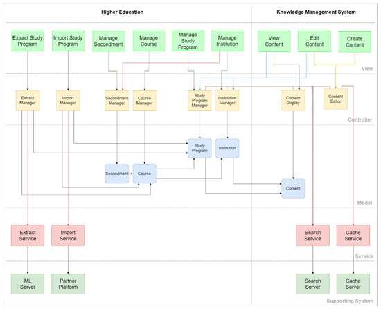 Overall, the architecture is structured to support both educational administration and content management efficiently, enabling the comprehensive management of educational programs and resources. Figure 11 provides a visual representation of the interactions between these components, highlighting the modular and integrated nature of the HEI-IS and KMS.