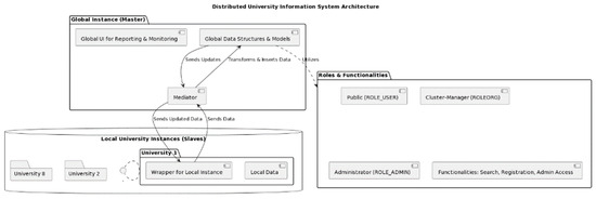 The HEI-IS mediator wrapper architecture, illustrated in Figure 12, demonstrates a distributed university information system framework that integrates global and local instances. This architecture employs a mediator component, which acts as an intermediary between the global and local instances. The global instance (master) includes the global UI for reporting and monitoring, as well as global data structures and models. The mediator facilitates the sending, transforming, and inserting of data updates.