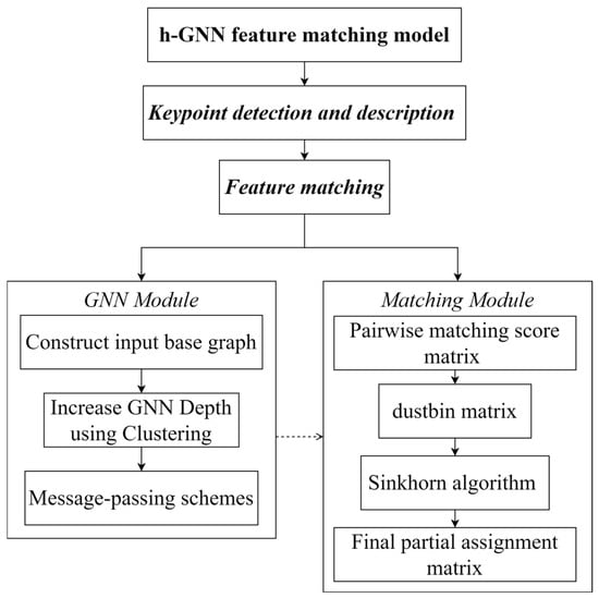 General overview of steps, modules, and sub-steps of the proposed h-GNN. The h-GNN process initiates with keypoint detection from distinctive features in input images, followed by computing descriptors for each keypoint. Subsequently, feature matching identifies correspondences between keypoints across different images. The model enhances robust feature matching through two primary modules: the GNN module and the matching module. The GNN module operates on a graph representation of keypoints, initially constructing an input base graph where nodes represent keypoints. Employing clustering techniques increases the GNN’s depth, facilitating message-passing among neighboring nodes to update keypoint node representations with local and global contextual information. The output from the GNN module is input to the matching module. Under the matching module, a pairwise matching score matrix is computed between matches of updated keypoint nodes from different images. A dustbin matrix handles outlier keypoints lacking reliable matches. The Sinkhorn algorithm refines initial matching scores by iteratively adjusting assignment probabilities, resulting in a more accurate final partial assignment matrix.