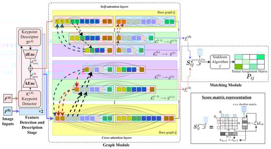 Technical details of the architecture and workflow of the proposed h-GNN. The workflow begins with the image inputs. Then, each of the image pair inputs is labeled as , and is processed by a keypoint detector, represented by different colored (red and blue) blocks. Keypoint descriptors and are also extracted from each image. After the image inputs’ section, the workflow can be divided into three main components. The first is the feature detection and description stage, where features are detected from both images. These features are encoded through two encoders, and , to produce keypoint descriptors. The second is the graph module, which consists of a base graph representation for the keypoint descriptors. Self- and cross-attention layers enhance feature representations within each graph. The type of attention layers is differentiated by the curved arrows, which show the nature of interaction between the two types of graphs. The third is the matching module, where a score matrix representation is derived from matching keypoints. The Sinkhorn algorithm produces a partial assignment matrix , indicating matches between keypoints in both images.