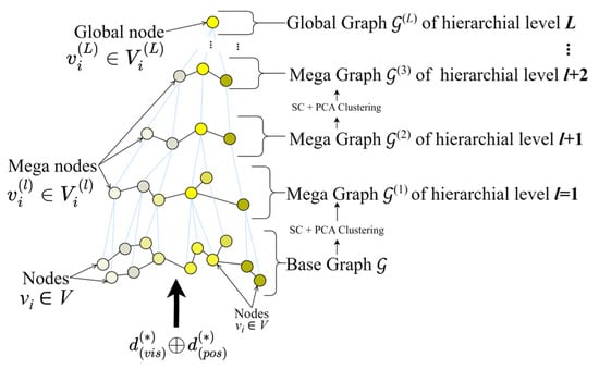 Figure 3 illustrates this procedure of increasing the h-GNN depth. From Figure 3, we can observe that the nodes of the base graph are grouped into mega-nodes of the mega-graph . Again, nodes within mega-graph at hierarchical level are further grouped into mega-nodes of the mega-graph at hierarchical level , and this progression continues iteratively until the global nodes create the global graph . At each hierarchical level of clustering, our proposed SC+PCA clustering method is applied. The final iteration of this clustering technique results in the creation of the global graph . The global graph is therefore the graph at the highest hierarchical level . Again, later in this section, details on SC+PCA are discussed.