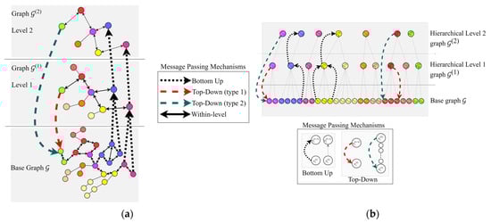 The rationale for presenting Equations (9) and (10) in this manner is similar to that of the previous equations, i.e., Equations (7) and (8). The breakdowns for these equations are therefore similar. For example, is a mega-node in , and is its corresponding node in the graph of the previous hierarchical level . Also, represents the within-level node representation of at level and message-passing iteration . In the hierarchical structure, denotes a lower level directly to . Again, is the updated within-level node representation after bottom-up message propagation. The practical application of the and the functions in Equations (9) and (10) are also similar to the previous Equations (7) and (8).