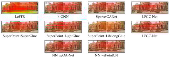 Feature correspondences of the ‘Semper statue Dresden’ image sequence set from Strach’s dataset. Our proposed model, h-GNN, which combined our SuperPoint feature detector, is compared with nine other image matching models. The results show that the h-GNN has more robustness when it comes to repeated features than that of the other baselines.