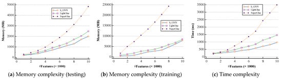 Efficiency comparison. We show the memory (testing and training) and time (training) usage with an increasing number of input features up to 10k.