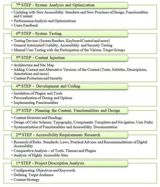 Before actually building the accessibility ecosystem, it is necessary to consider and systematize the development steps. In relation to the goals set for the design of an accessible ecosystem, they must, in the first place, ensure accessibility, i.e., accessibility-first web design. At the same time, they should correspond to the accepted stages in the development of a site and to the peculiarities of the use of CMS. On the other hand, designers must comply with the recommendations of UX/UI design and SEO, which will meet the expectations and needs of all visitors, provide an accessible and positive user experience, and achieve website visibility. Figure 1 shows a diagram of the development stages of the accessibility ecosystem through CMS, where accessibility is given the highest priority.