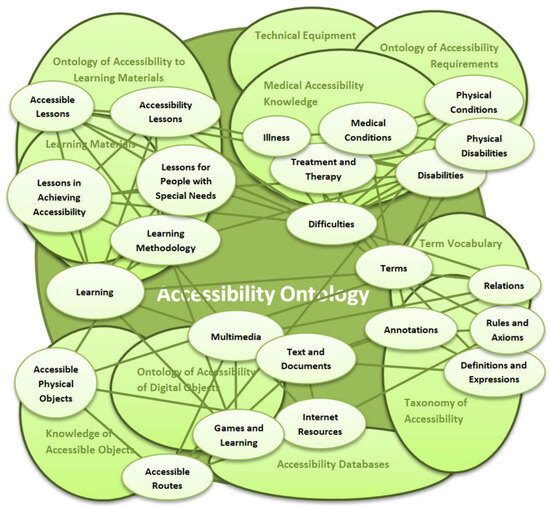 Separate ontological substructures are structured for the subject area, including Ontology of Accessibility, Ontology of Accessibility of Digital Objects, Ontology of Accessibility Requirements, Ontology for Accessibility to Learning Materials and Learning Processes, and Taxonomy of Accessibility. More about the structure and organization of the ontology can be found in [36]. The ontology is developed using custom collaborative ontology engineering methodology. The process consists of a formal definition of the tasks required for design and consultation with different professionals (accessibility experts, education specialists, IT professionals, etc.) participating in the development.