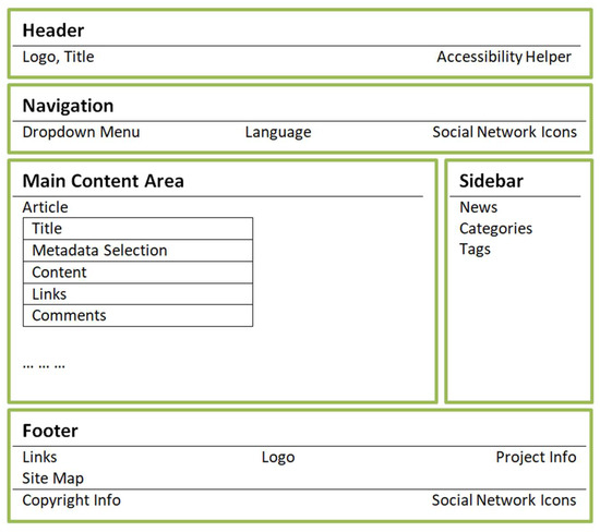 The creation of content and the selection of the placement of elements on each page of the site are subject to the requirements of familiarity (by adhering to established patterns), usability (by providing alternatives), readability (by careful selection and optimization of texts and descriptions), hierarchy (through sections and subheadings), contrast (marking important elements with or without color), orderliness (through lists and sections), quick navigation (through precise and short link labels). Figure 4 shows a diagram of the arrangement of the elements, which ensures balance, proportionality, and consistency.