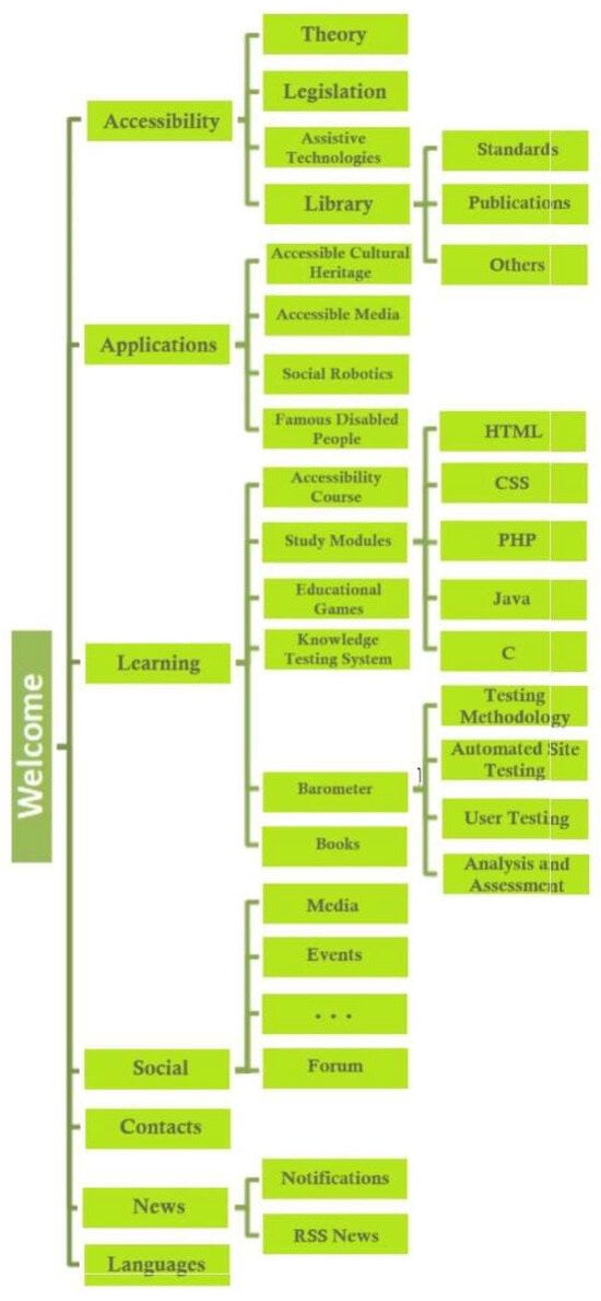 Building the information structure is a complex and lengthy process that also depends on the scope of the content. In the development of the AB ecosystem, various goals have been set, such as site accessibility research and accessibility education, systematization of up-to-date information and digital resources on the topic of accessibility, etc. The hierarchy of content must meet all the recommendations systematized above, be balanced and user-friendly for visitors, and navigation should offer quick and unmistakable orientation. Figure 2 presents a diagram of the modules of the ecosystem, which presents the content in a website tree structure.